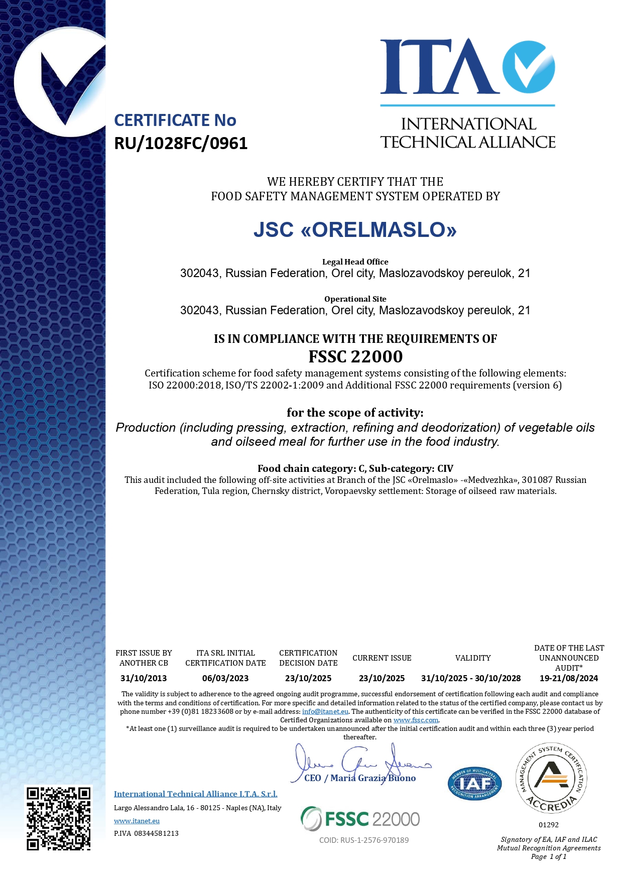 Is in compliance with the requirements of: FSSC 22000: Food Safety System Certification 22000. Release date 18.10.2024