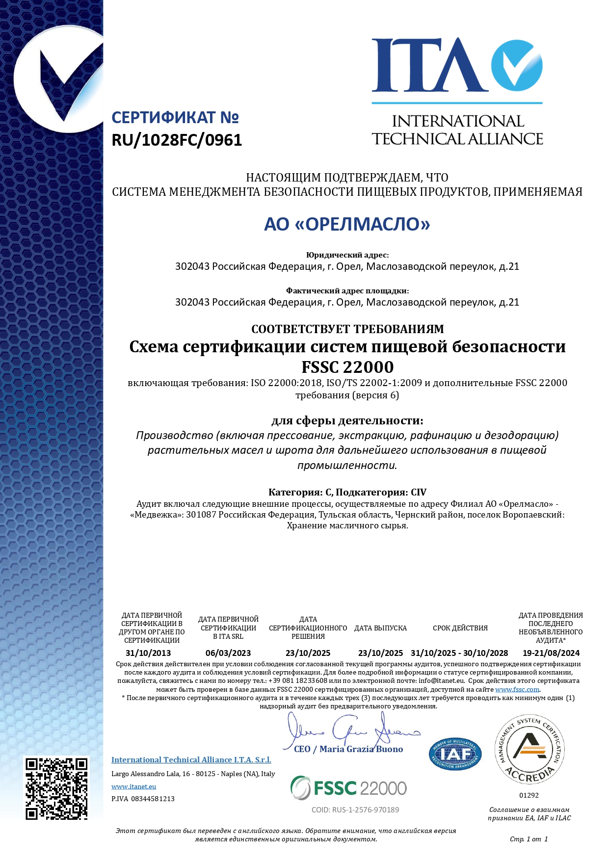 Соответствие стандарту FSSC 22000: Схема сертификации систем пищевой безопасности. Дата выпуска 23.10.2025